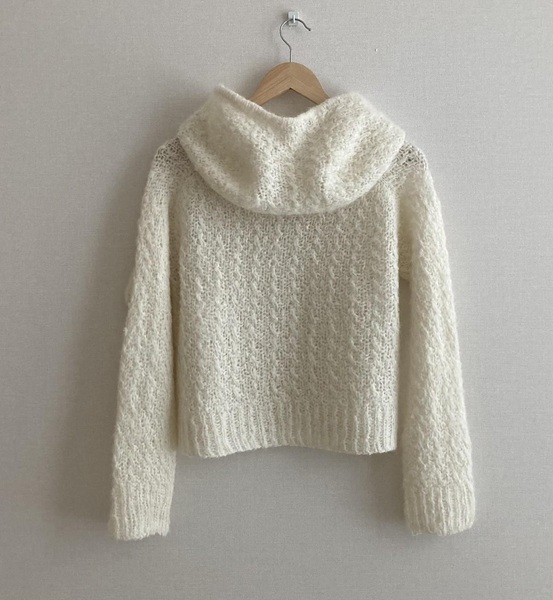 Пуловер-худи Brioche связан из легкой по весу, но при этом объемной пряжи из вспушенного альпака, простым текстурным узором Мох с комбинацией косичек на 2-х петлях. Пуловер вяжется без швов, сверху вниз. В начале работы выполняется спинка с формированием скошенной линии плеч (японское плечо).